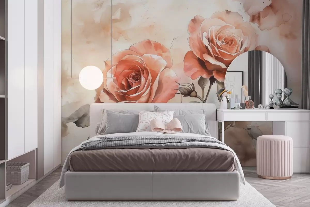 Beautiful red roses in watercolor style, floral, beige colors - Wall mural (No. w02486)