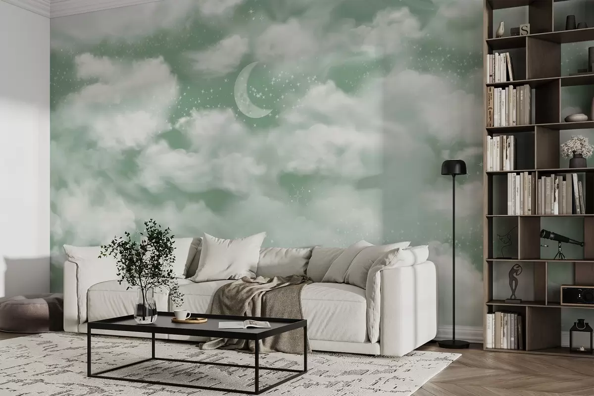 Starry sky with moon and clouds, dreamy, ethereal, soft green colors - Wall mural (No. w02515v2)