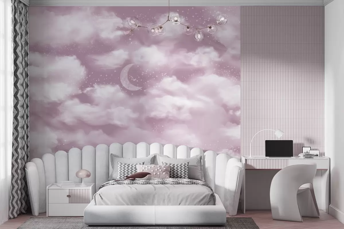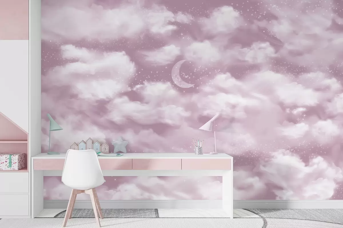 Starry sky with moon and clouds, dreamy, ethereal, soft pink colors - Wall mural (No. w02515v3)