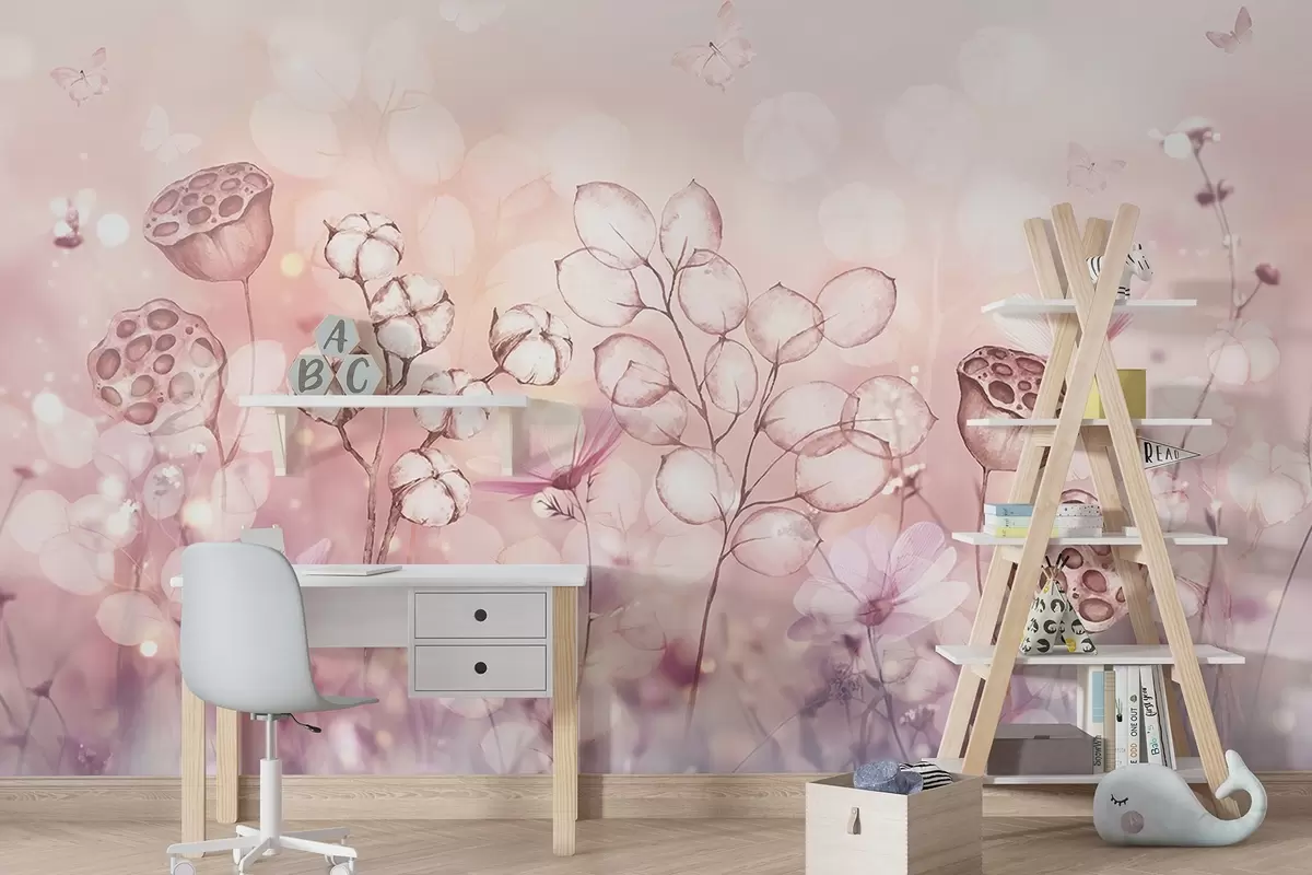 Dreamy flower garden, butterfly, cotton flowers, lotuses, pink colors - Wall mural (No. w02516)