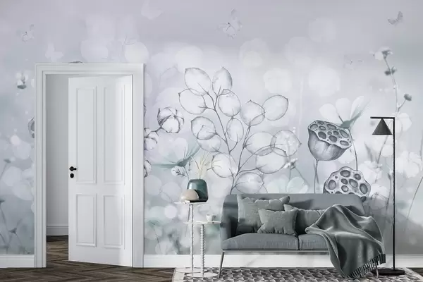 Dreamy flower garden, butterfly, cotton flowers, lotuses, grey colors - Wall mural (No. w02516v2)