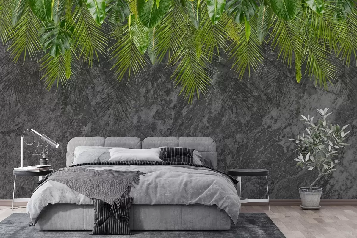 tropical leaves on the background of imitation stone - Wall mural (No. w02547)