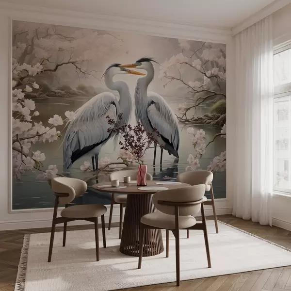 A pair of storks in a blooming garden - Wall mural (No. w02621)