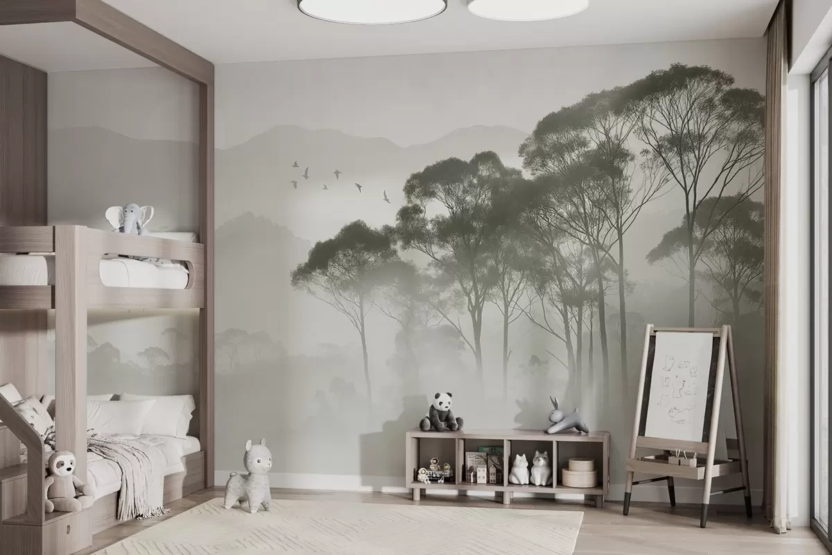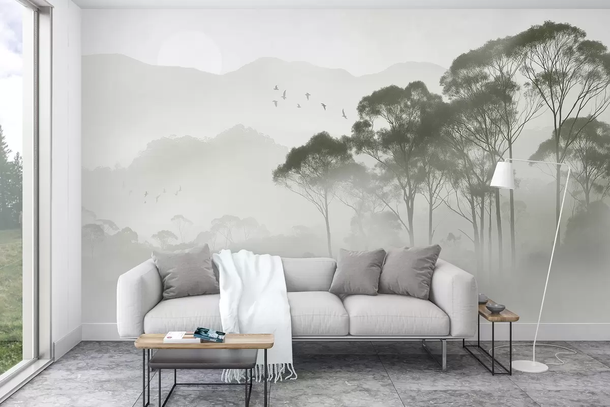 Trees in the fog, nature landscapes, birds, sun, green colors - Wall mural (No. w02740)