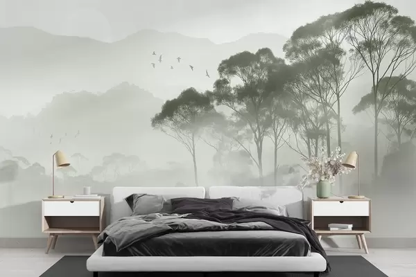 Trees in the fog, nature landscapes, birds, sun, green colors - Wall mural (No. w02740)