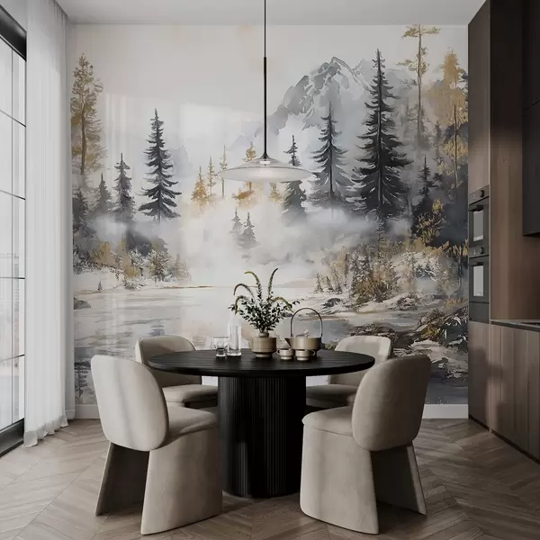 Winter landscape with lake and forest, mountains, pastel style darwing - Wall mural (No. w02741)