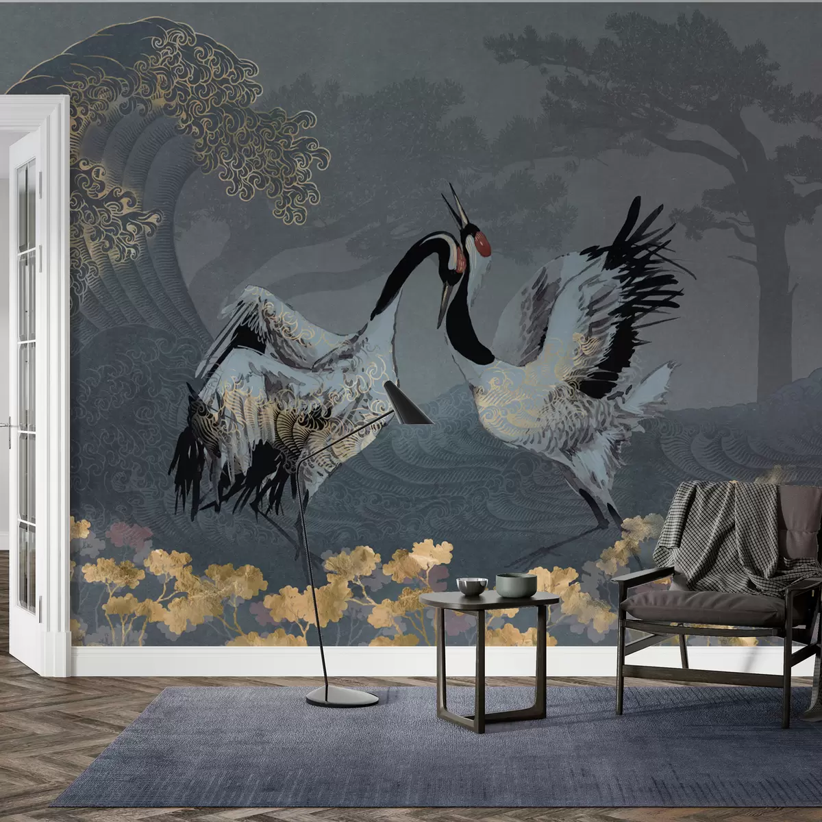 Cranes, trees and waves with Chinese style elements - Wall mural (No. w02747)