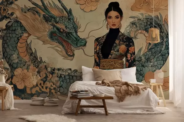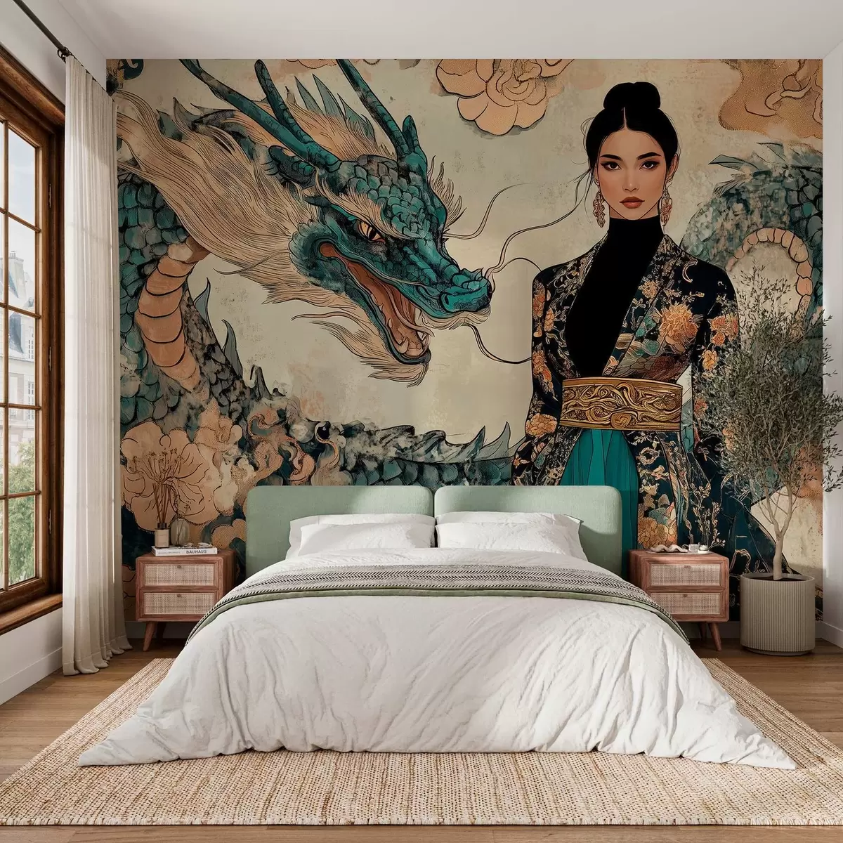 Woman in a robe with a dragon, oriental style - Wall mural (No. w02875)