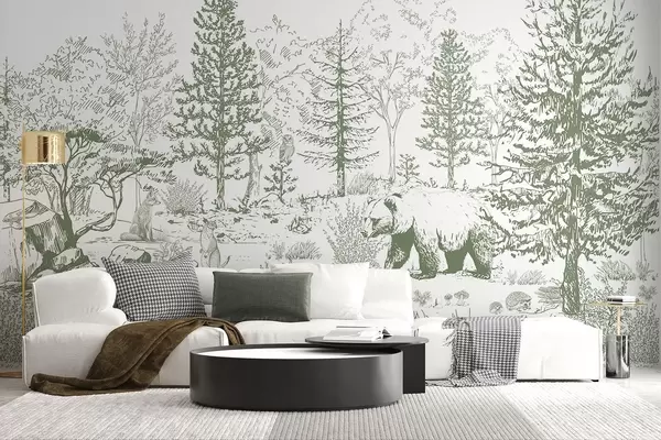 Forest life, trees, wild animals, bear, fox, owl, bushes, pencil style drawing, green colors - Wall mural (No. w02929v2)