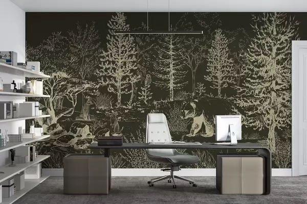 Forest life, trees, wild animals, bear, fox, owl, bushes, dark green background - Wall mural (No. w02929v3)