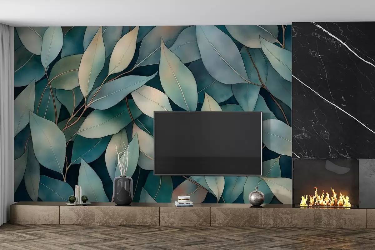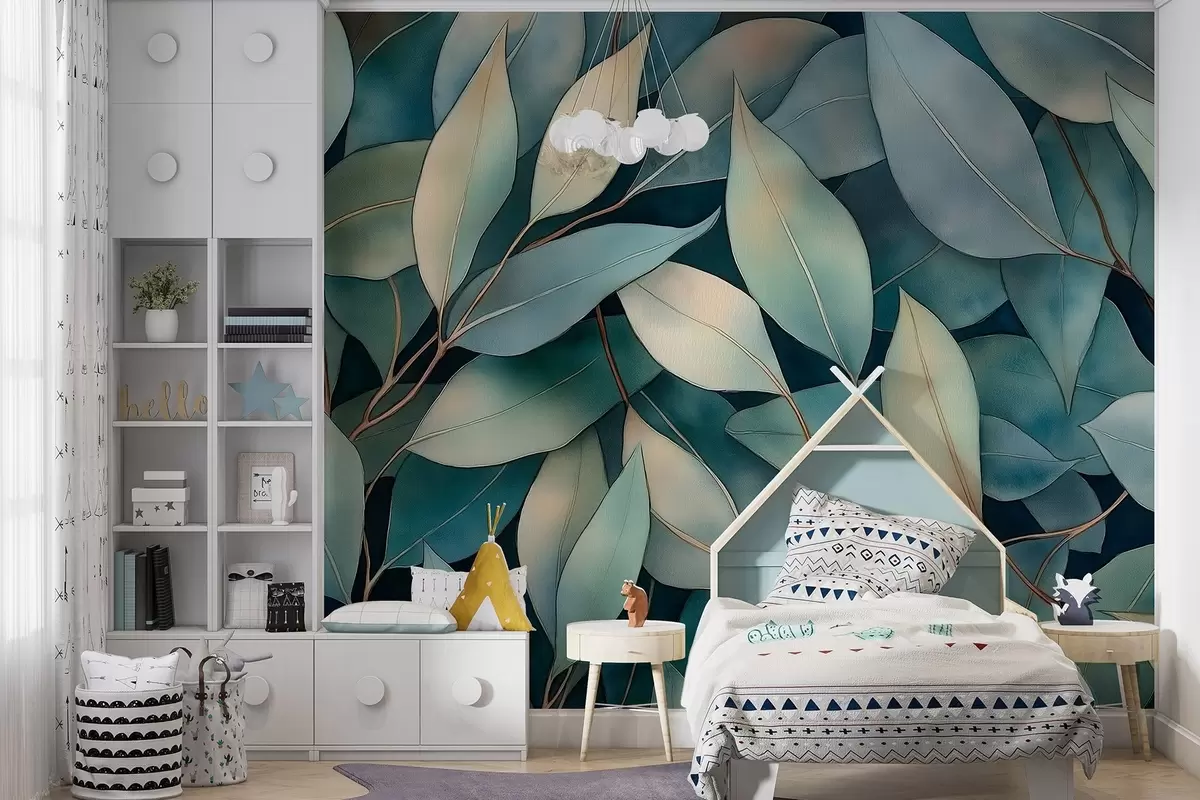 Eucalyptus leaves, watercolor style drawing, floral pattern, green colors - Wall mural (No. w02931)
