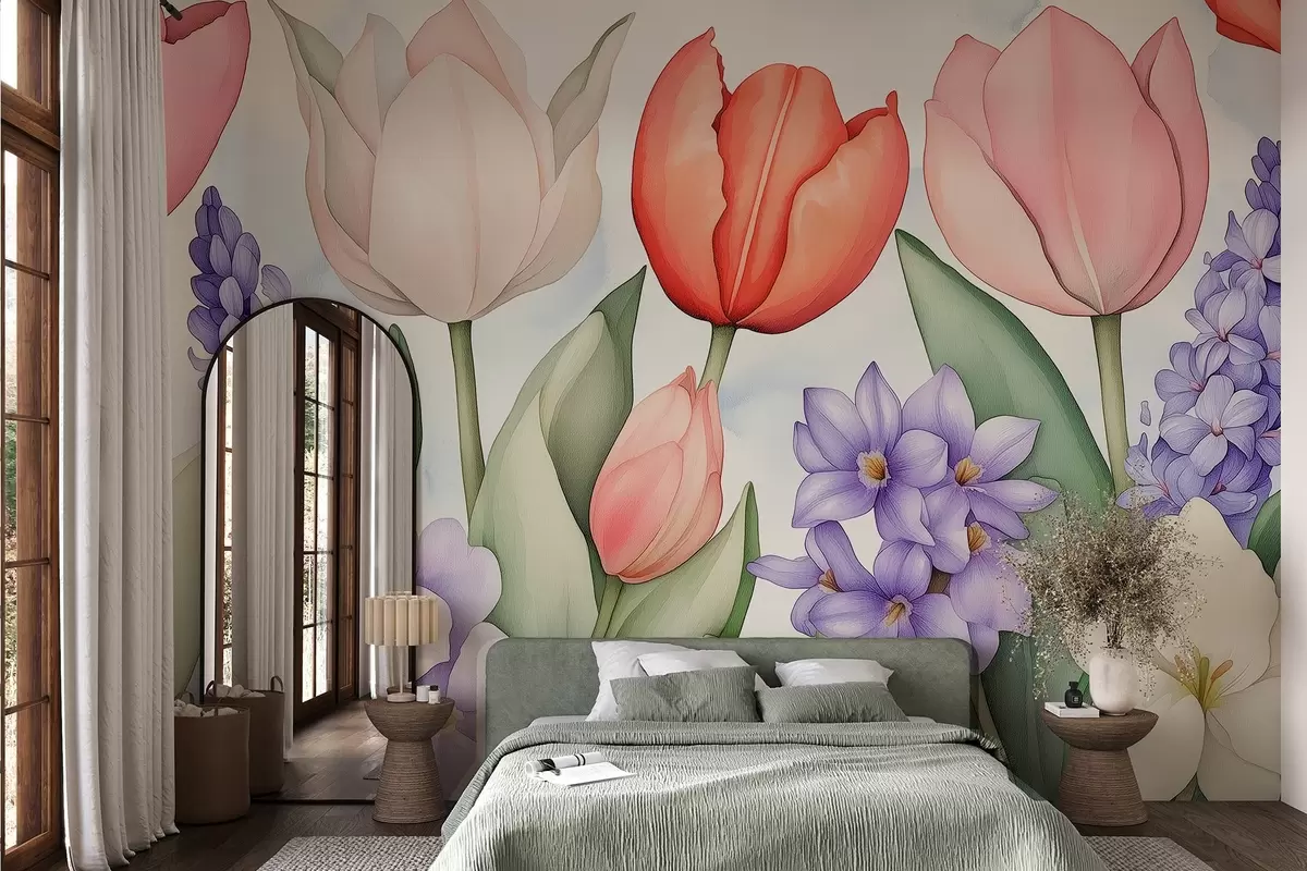Spring flowers, tulips, hyacinth, watercolor style drawing, floral - Wall mural (No. w02940)