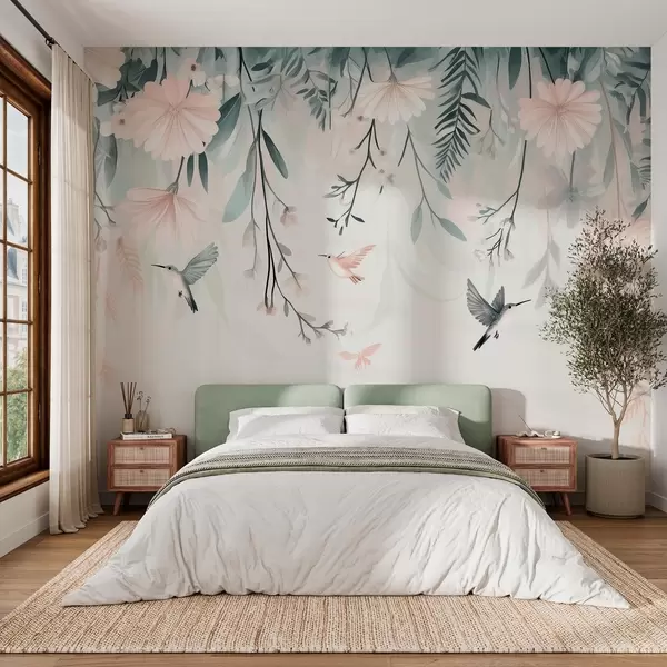 pink flowers in imitation of painting technique hanging from above - Wall mural (No. w03012)