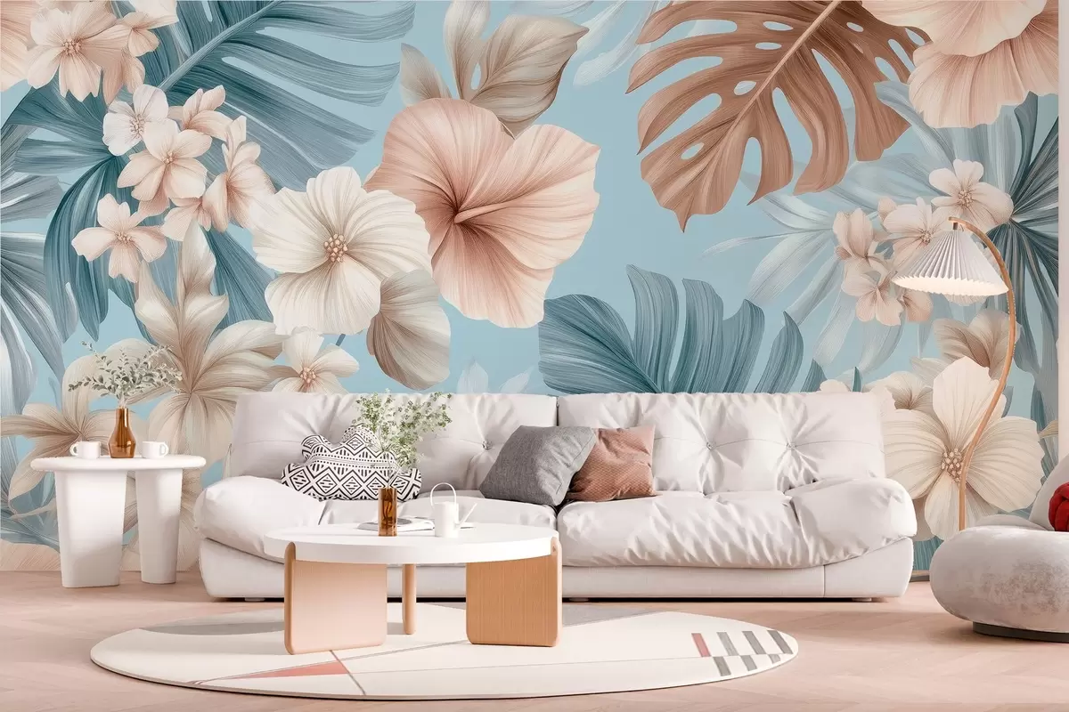 tropical print with large leaves and flowers in pastel blue and beige colors - Wall mural (No. w03013)