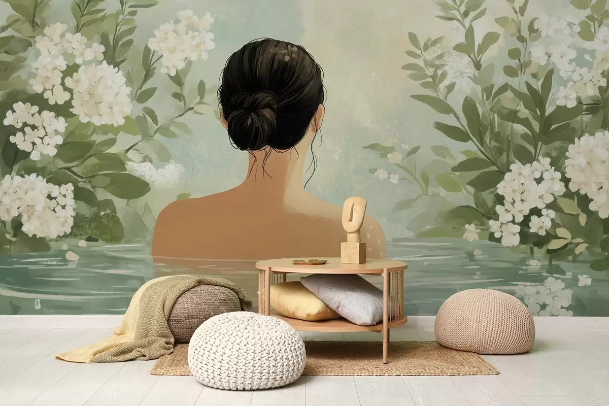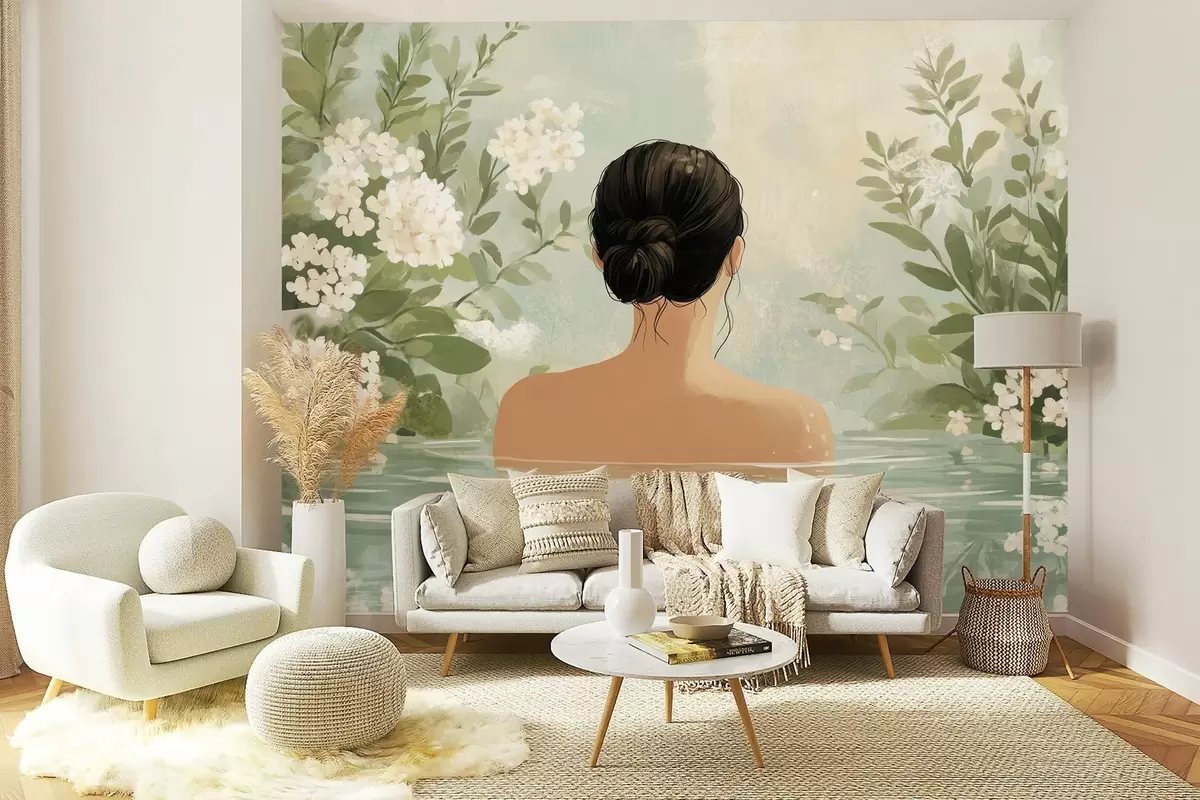 a serene and dreamy botanical illustration of a woman bathing in a calm, reflective body of water, surrounded by lush greenery and delicate white flowers. - Wall mural (No. w03014)