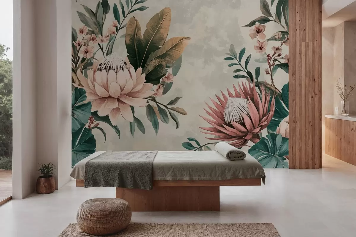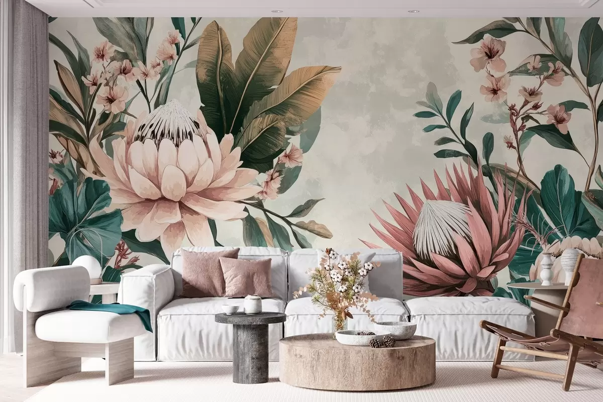 exotic plants, palm leaves and protea flowers inspired by vintage - Wall mural (No. w03015)