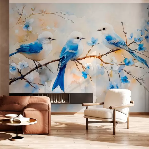 spring songbirds on a tree branch in watercolor style - Wall mural (No. w03112)