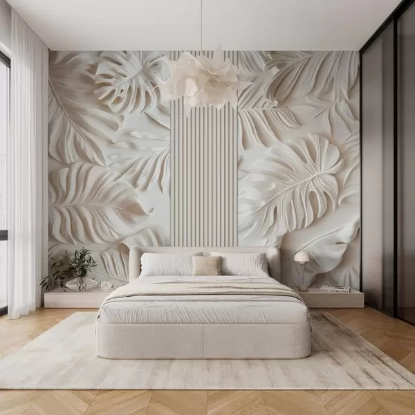 large tropical leaves imitation of bas-relief and panels in light colors - Wall mural (No. w03119)