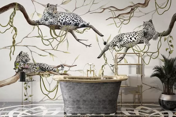 Leopards on the jungle trees, lianas, tropical, wild animals, pastel color pallete - Wall mural (No. w03146v4)