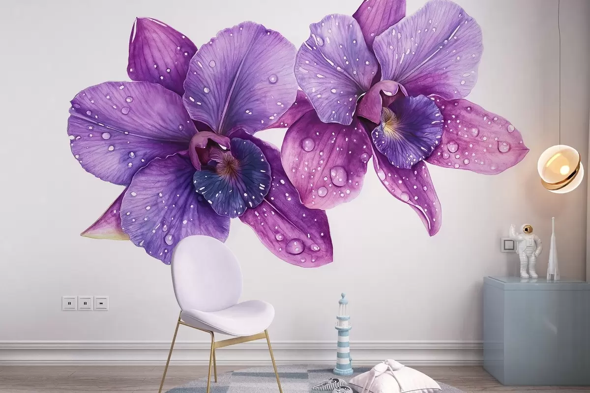 Beautiful orchid flowers, watercolor style drawing, violet colors - Wall mural (No. w03164)
