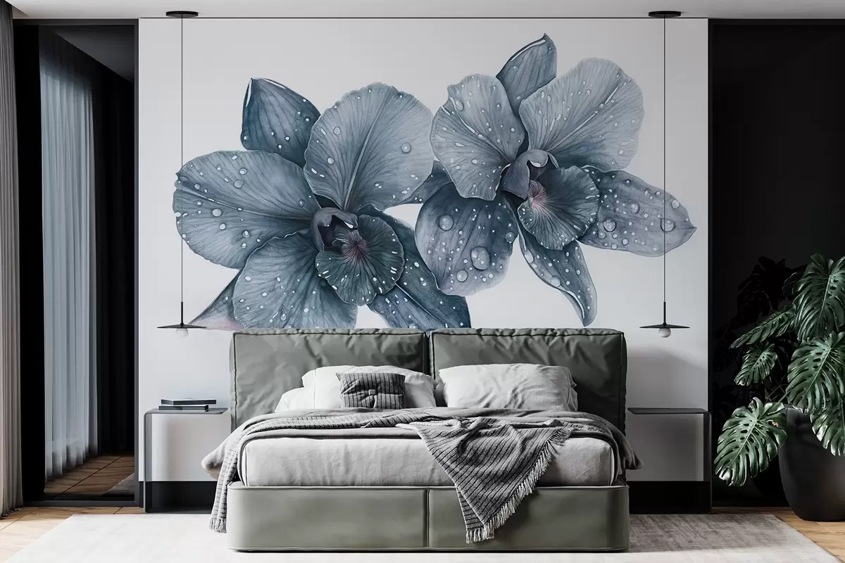Beautiful orchid flowers, watercolor style drawing, blue colors - Wall mural (No. w03164v2)