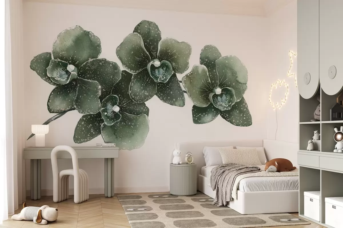 Orhid flower branch, watercolor style, floral, green colors - Wall mural (No. w03165v1)