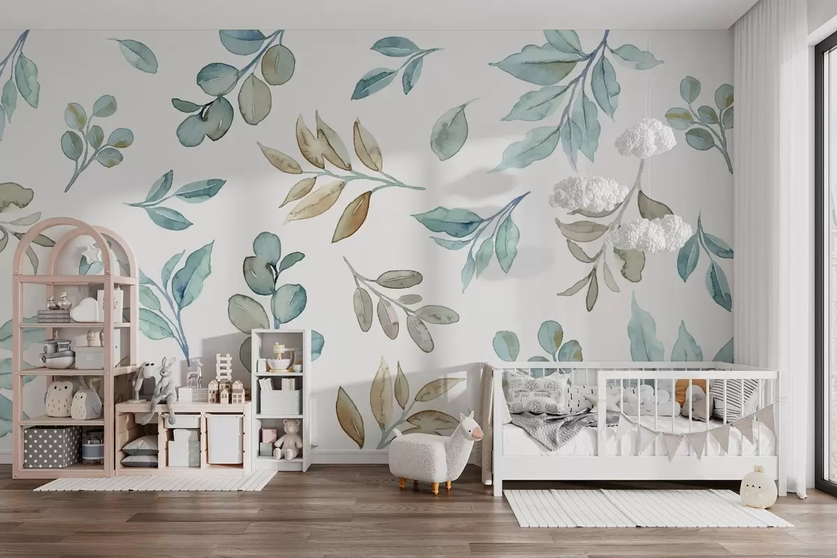 various leaves and branches in watercolor technique in blue and beige tones on a white background - Wall mural (No. w03280)