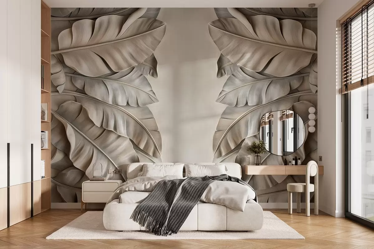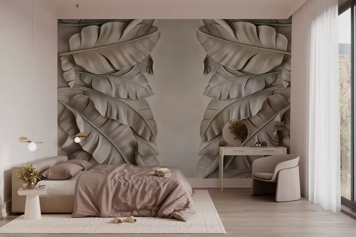 imitation of a bas-relief with tropical leaves in beige tones - Wall mural (No. w03285)