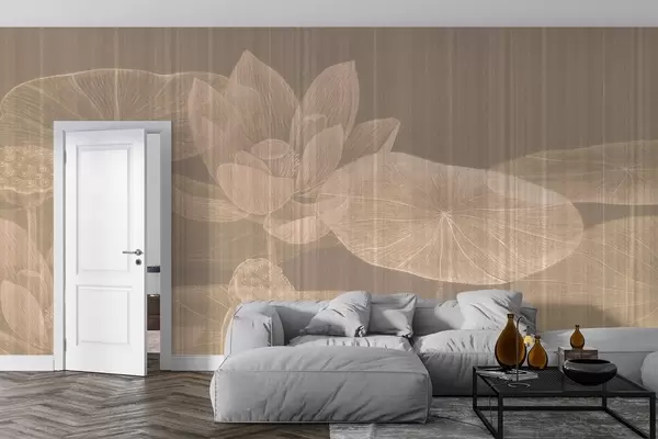 Elegant illustration of lotuses and lily pads in pastel shades with a textured linen effect, - Wall mural (No. w03324v2)