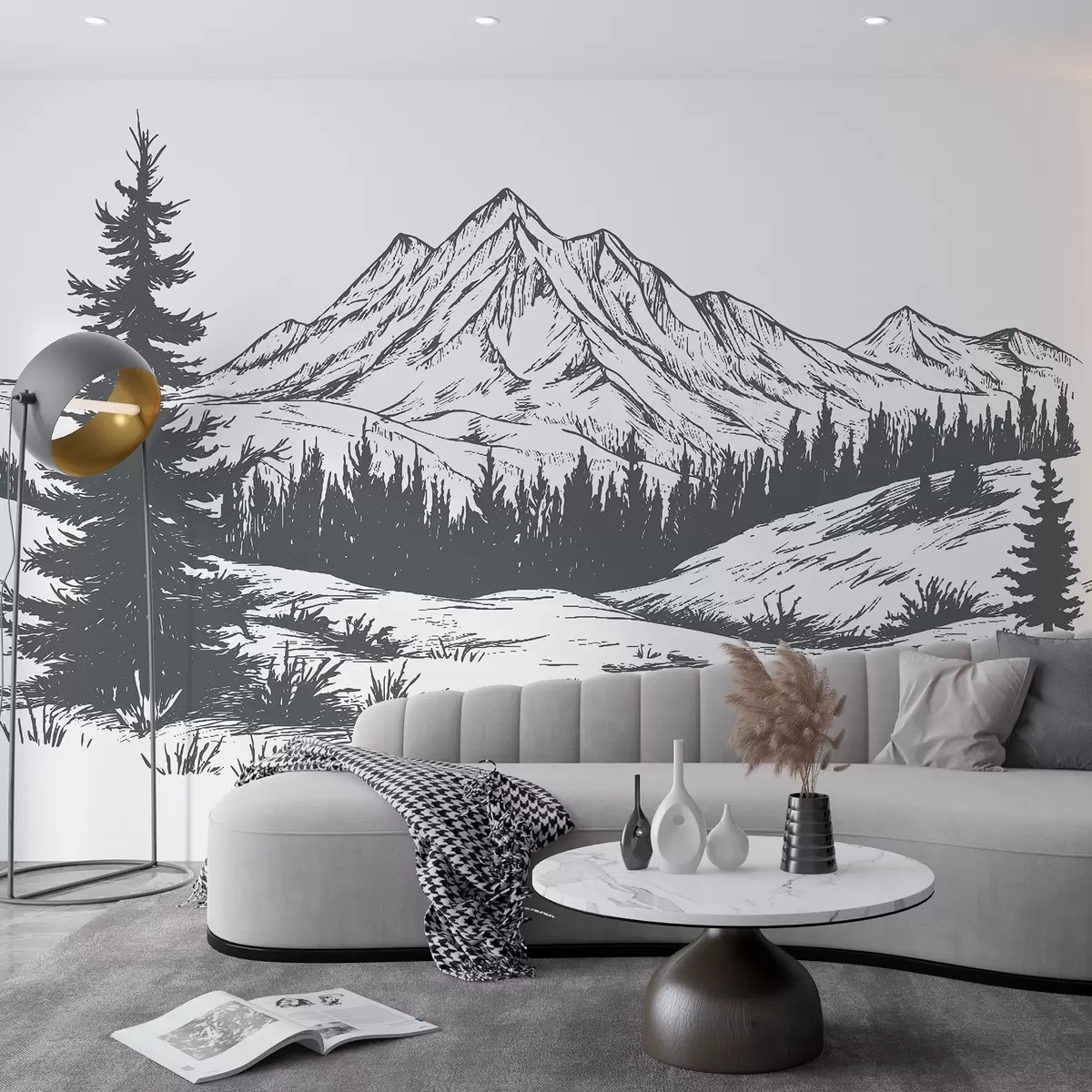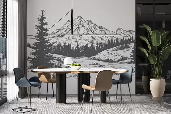 Mountains landscape with pine trees, forest, nature, dark grey color - Wall mural (No. w03344)