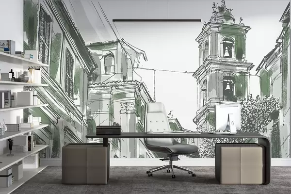 Mediterranean city street, chapel, architecture, grey and green colors - Wall mural (No. w03350v2)