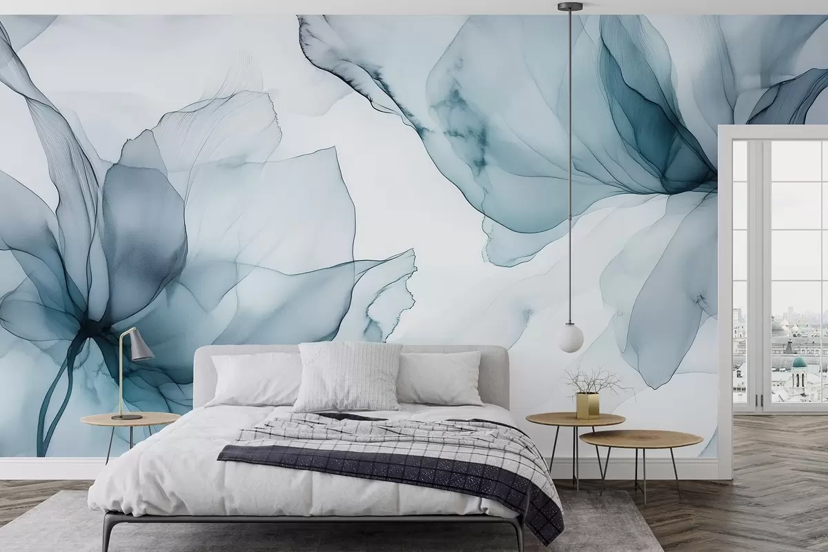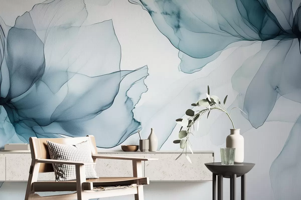 Fluid style flowers, floral abstraction, watercolor, blue color palette - Wall mural (No. w03406v2)