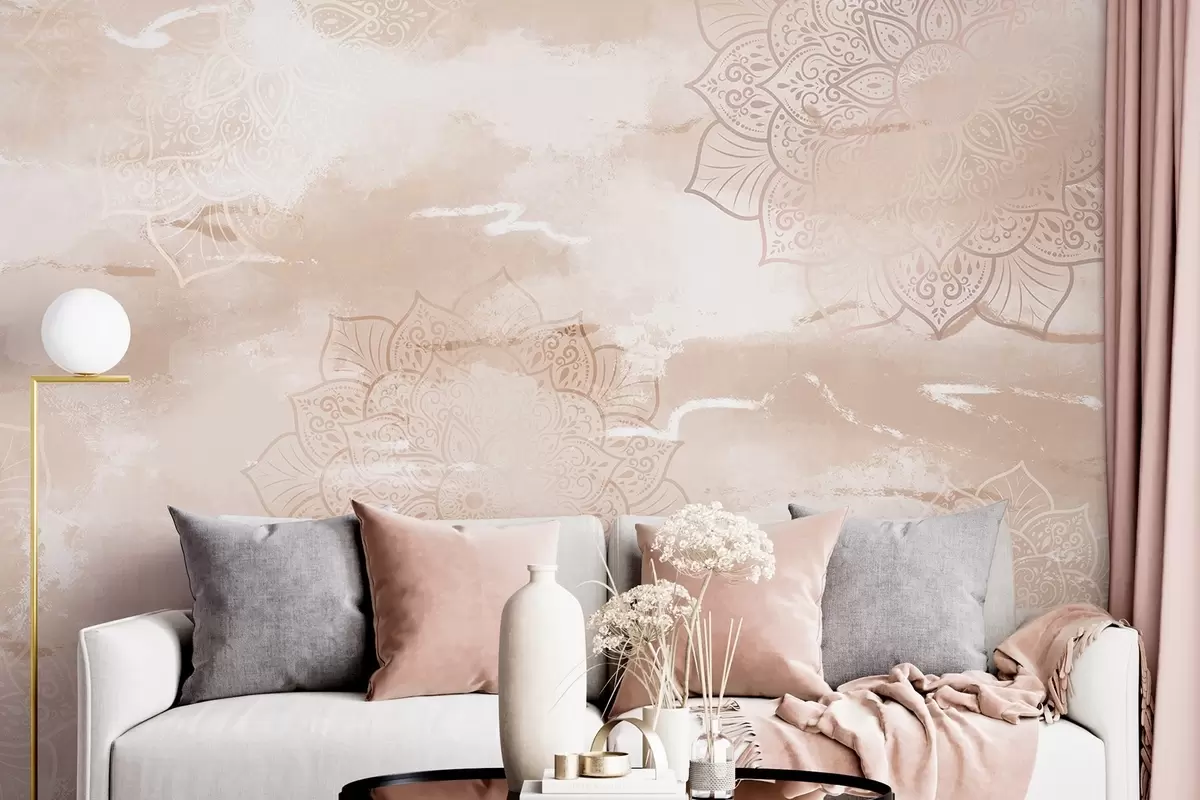 Mandalas on the pastel background, vivid brush strokes, beige colors - Wall mural (No. w03409)
