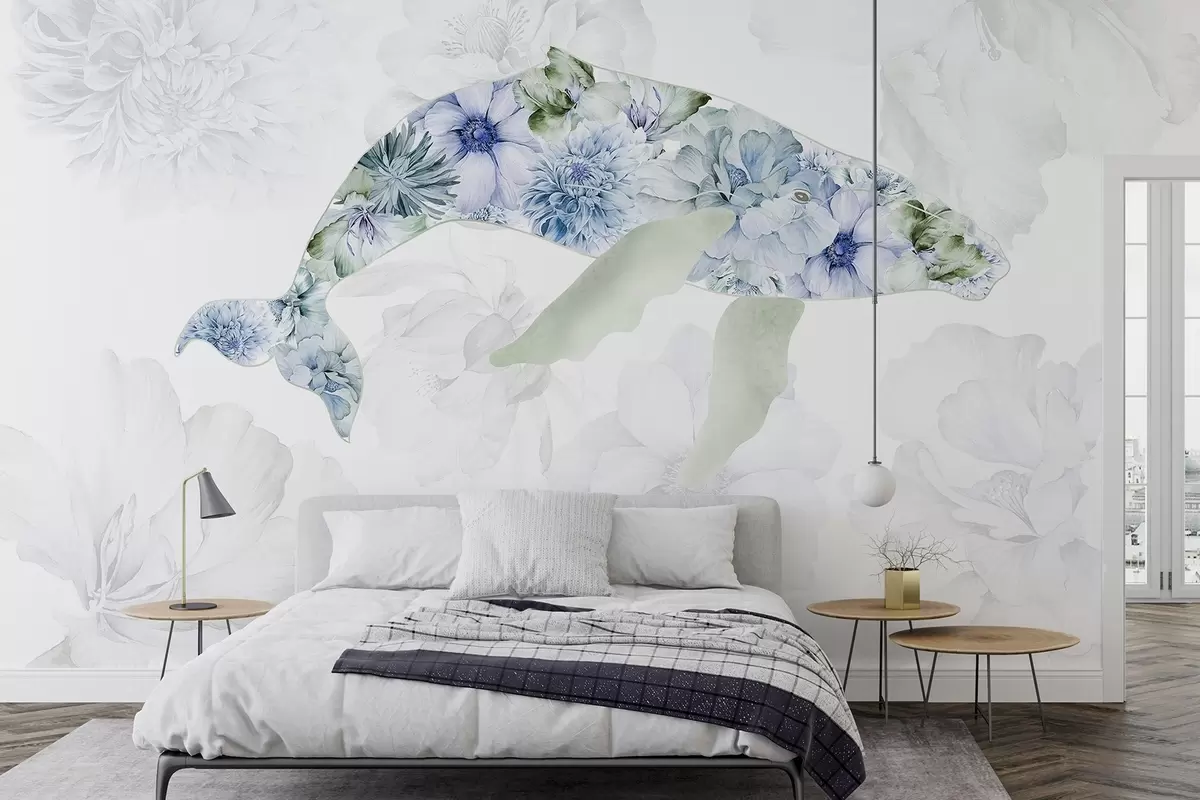 Whale with watercolor flowers, ocean animals, minimalism, blue and green - Wall mural (No. w03446v2)
