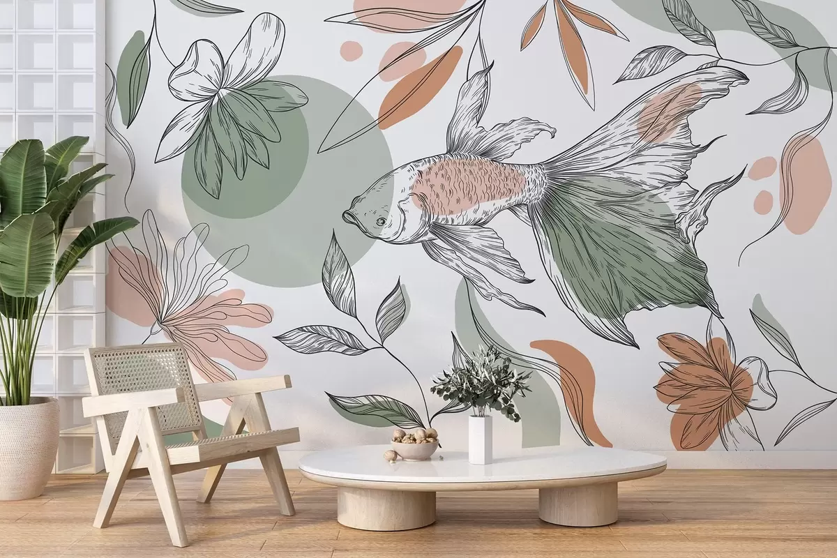 Line drawing fish with flowers, minimalism, marine, floral, natural colors - Wall mural (No. w03448)