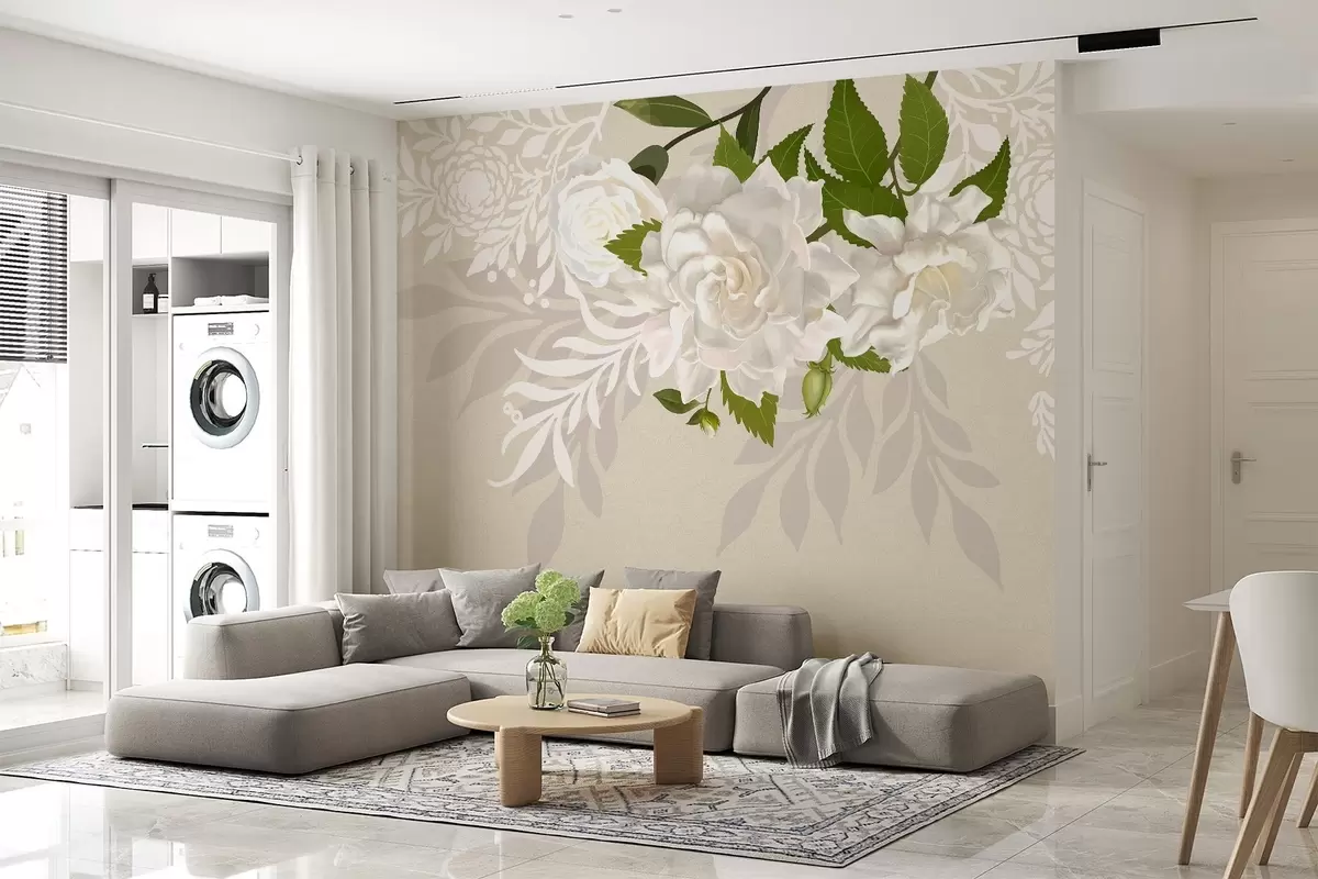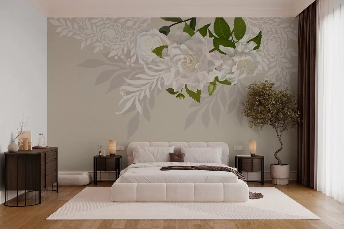 white roses on a beige patterned background - Wall mural (No. w03453)