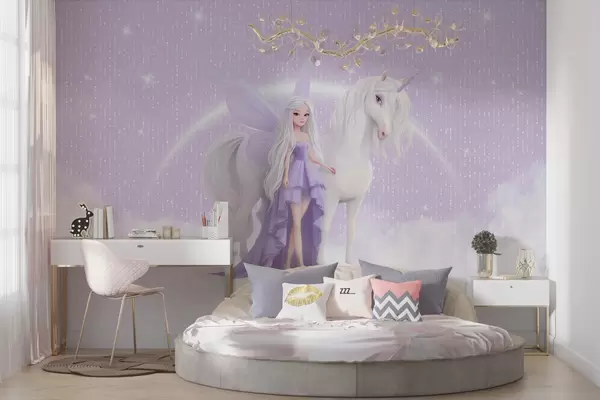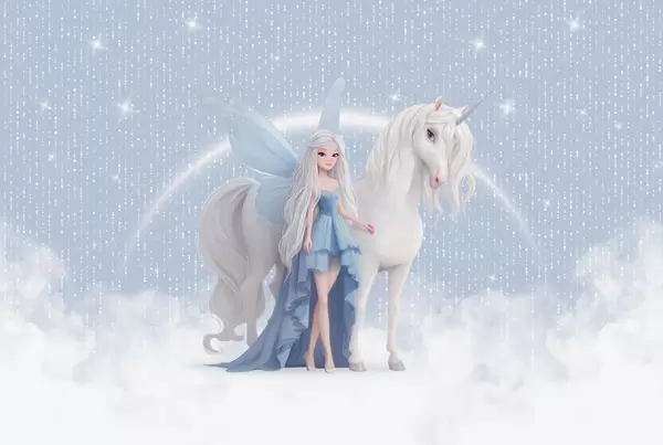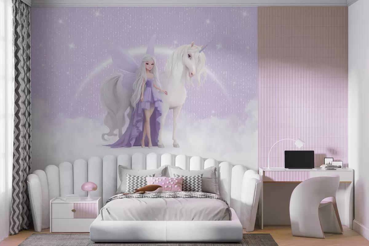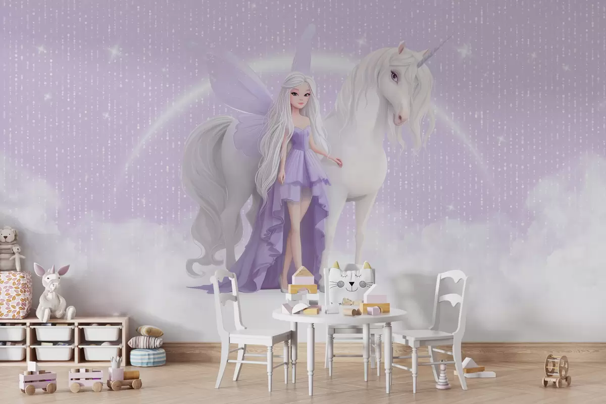 A fairy with a unicorn among the clouds - Wall mural (No. w03527)