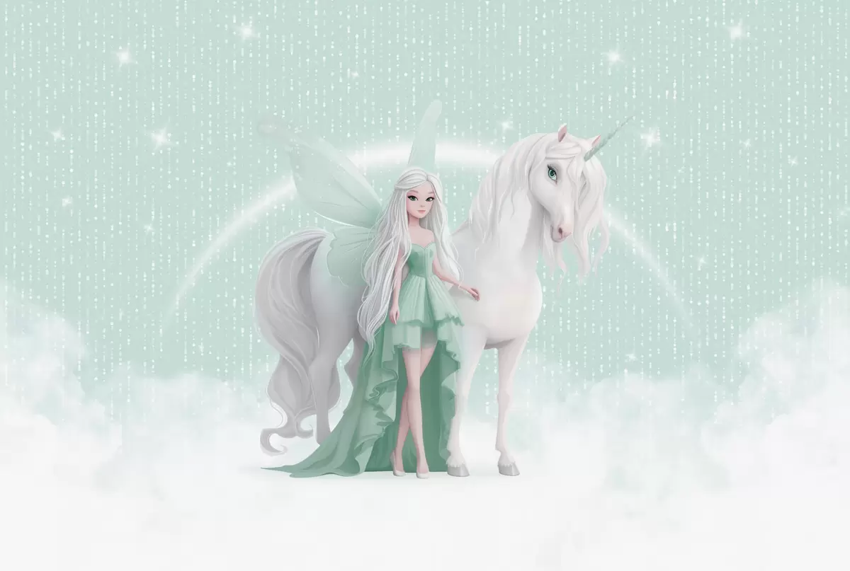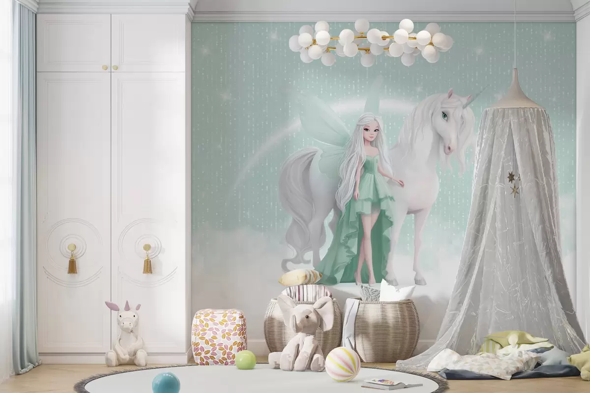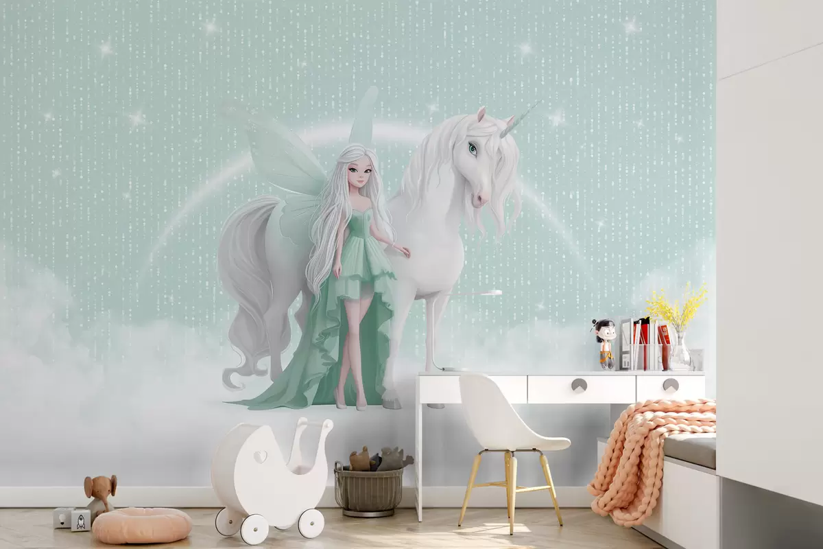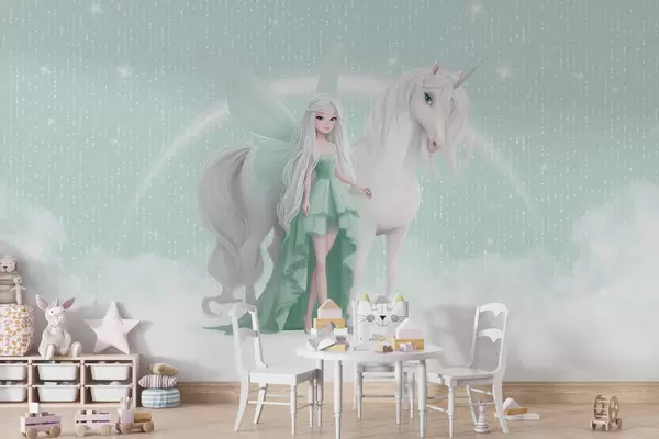 A fairy with a unicorn among the clouds - Wall mural (No. w03527v2)