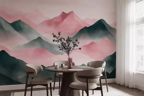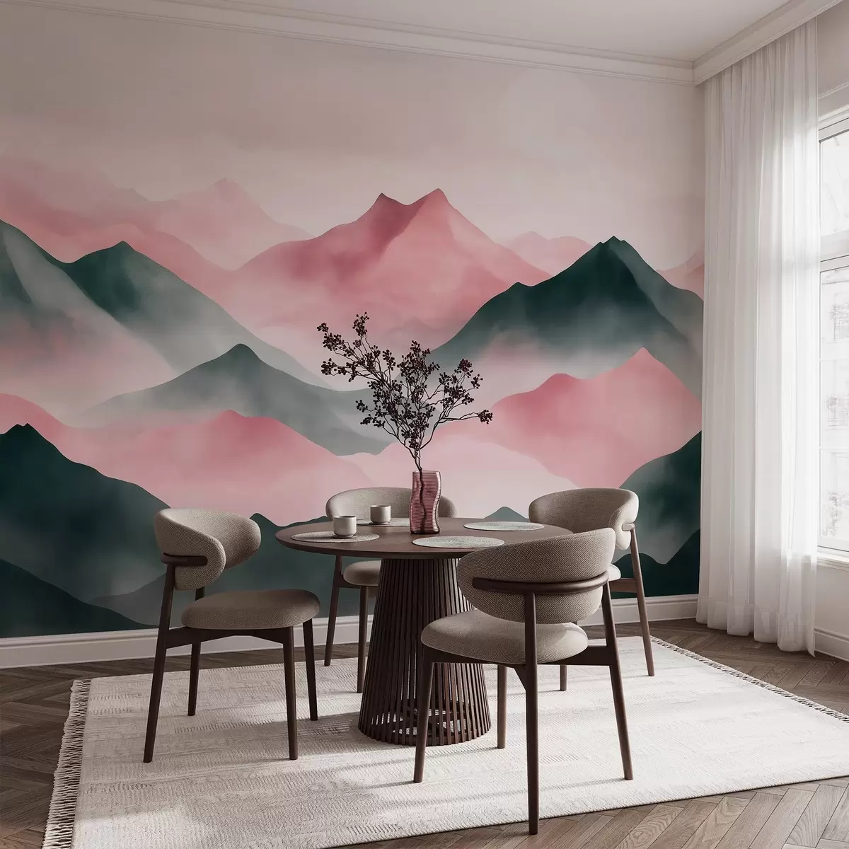 Mountains landscapes, watercolor style, mist, pink and grey - Wall mural (No. w03548v1)