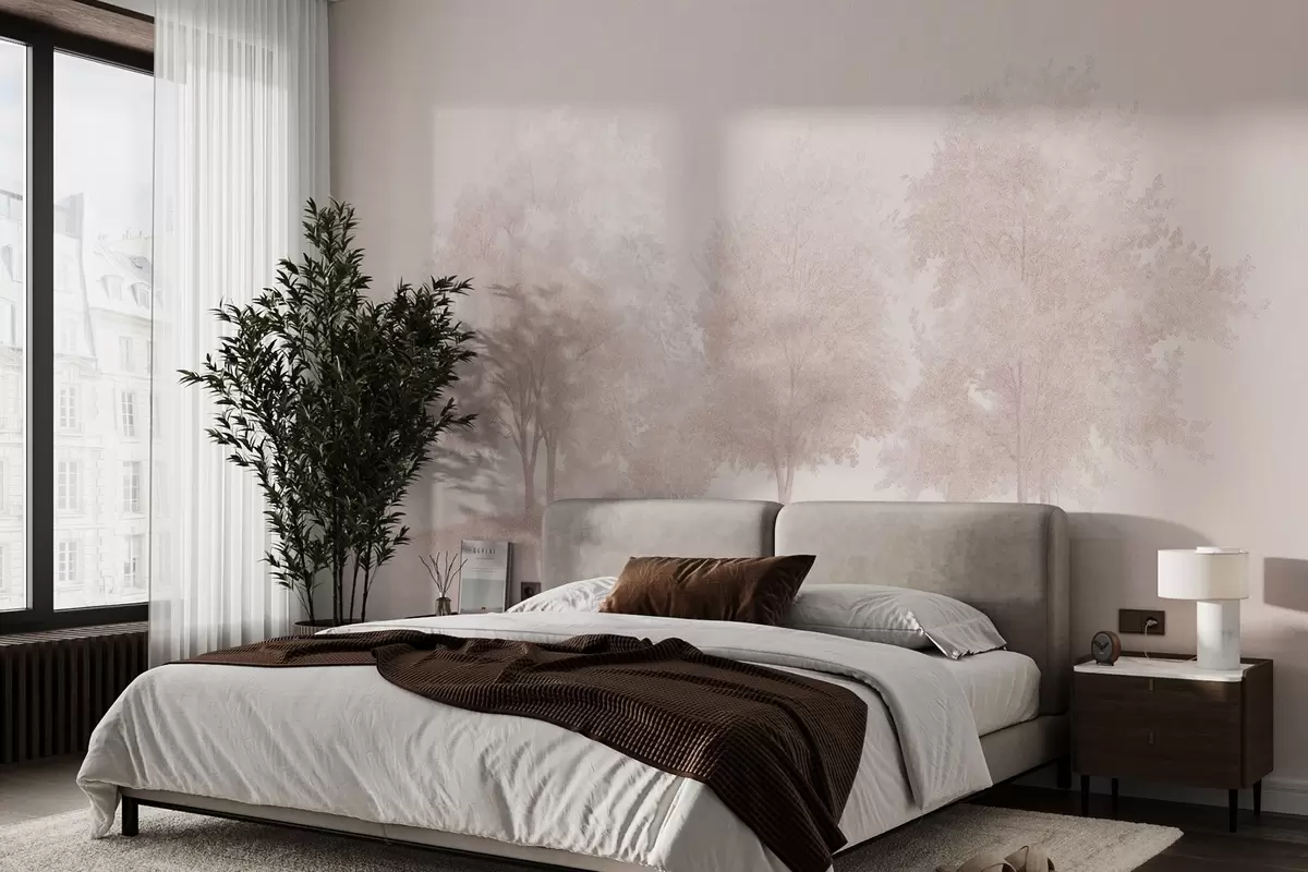 Blossom trees, spring, pencil style drawing, pink colors, nature - Wall mural (No. w03549)