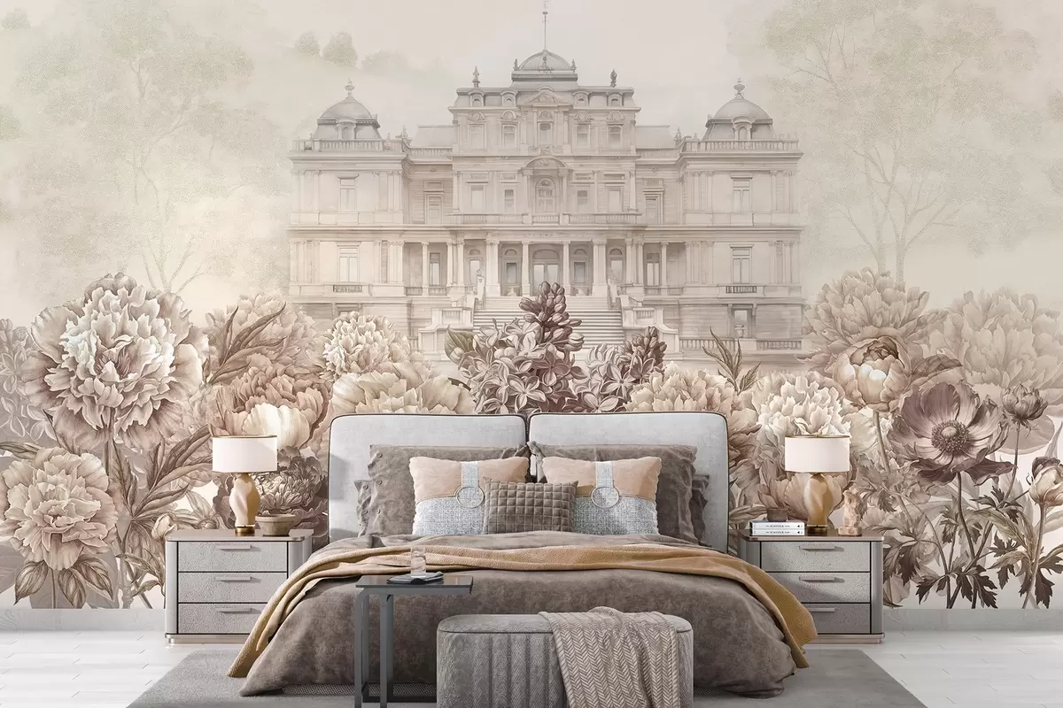 Royal palace with peony garden, watercolor style, nature, beige colors, boho - Wall mural (No. w03552)