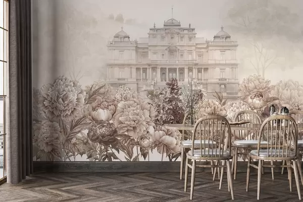 Royal palace with peony garden, watercolor style, nature, beige colors, boho - Wall mural (No. w03552)