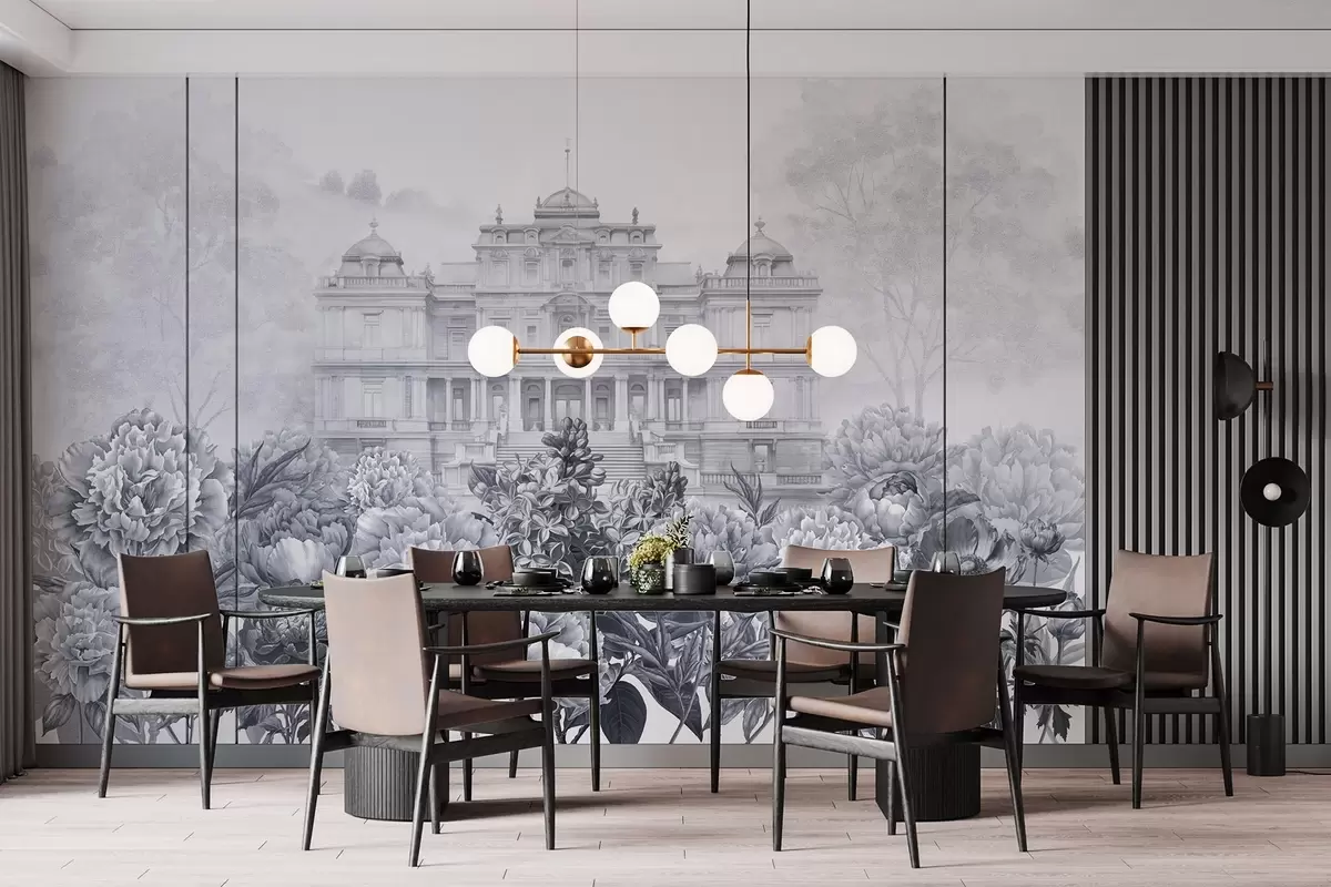 Royal palace with peony garden, watercolor style, nature, blue colors, boho - Wall mural (No. w03552v1)