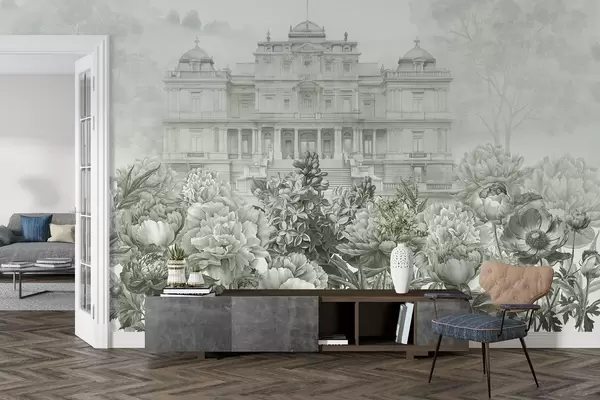 Royal palace with peony garden, watercolor style, nature, green colors, boho - Wall mural (No. w03552v2)