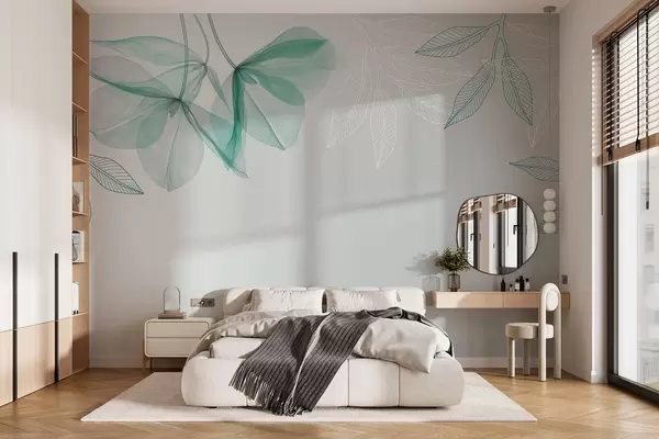 delicate translucent flowers and leaves in green tones - Wall mural (No. w03616v1)