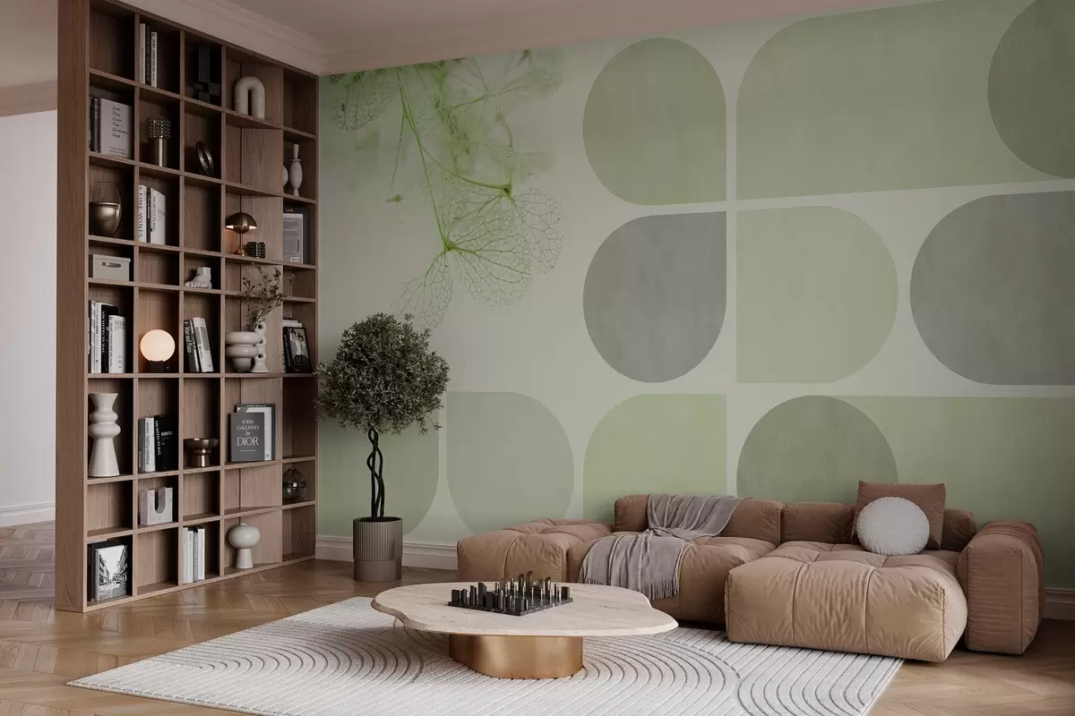 geometry and dried flowers with veins in green tones - Wall mural (No. w03617v1)
