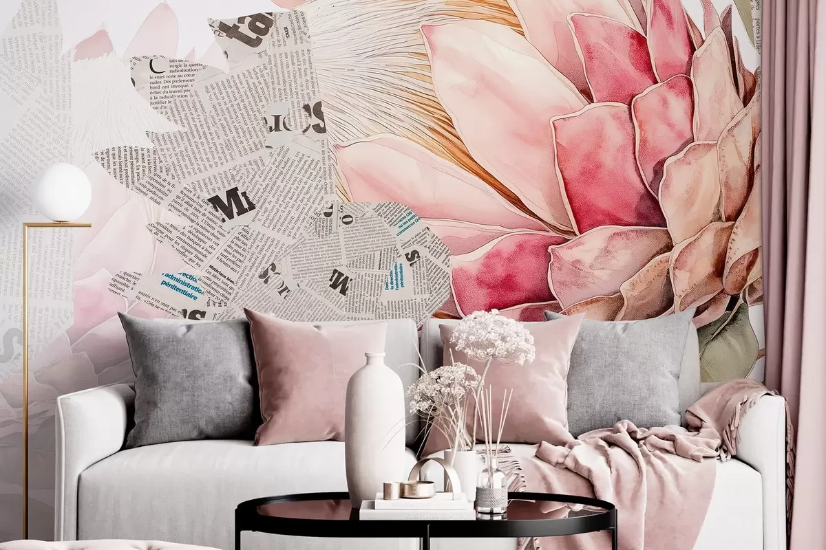 Protea flowers, newspaper art, floral, tropical, natural colors - Wall mural (No. w03667)