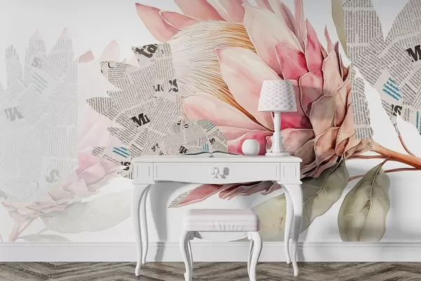 Protea flowers, newspaper art, floral, tropical, natural colors - Wall mural (No. w03667)