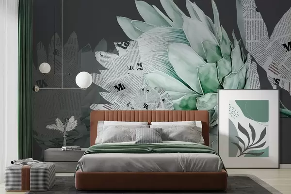 Protea flowers, newspaper art, floral, tropical, dark background, green colors - Wall mural (No. w03667v3)
