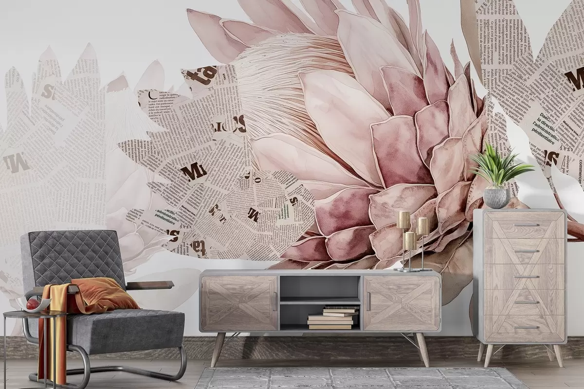 Protea flowers, newspaper art, floral, tropical, pastel beige colors - Wall mural (No. w03667v4)
